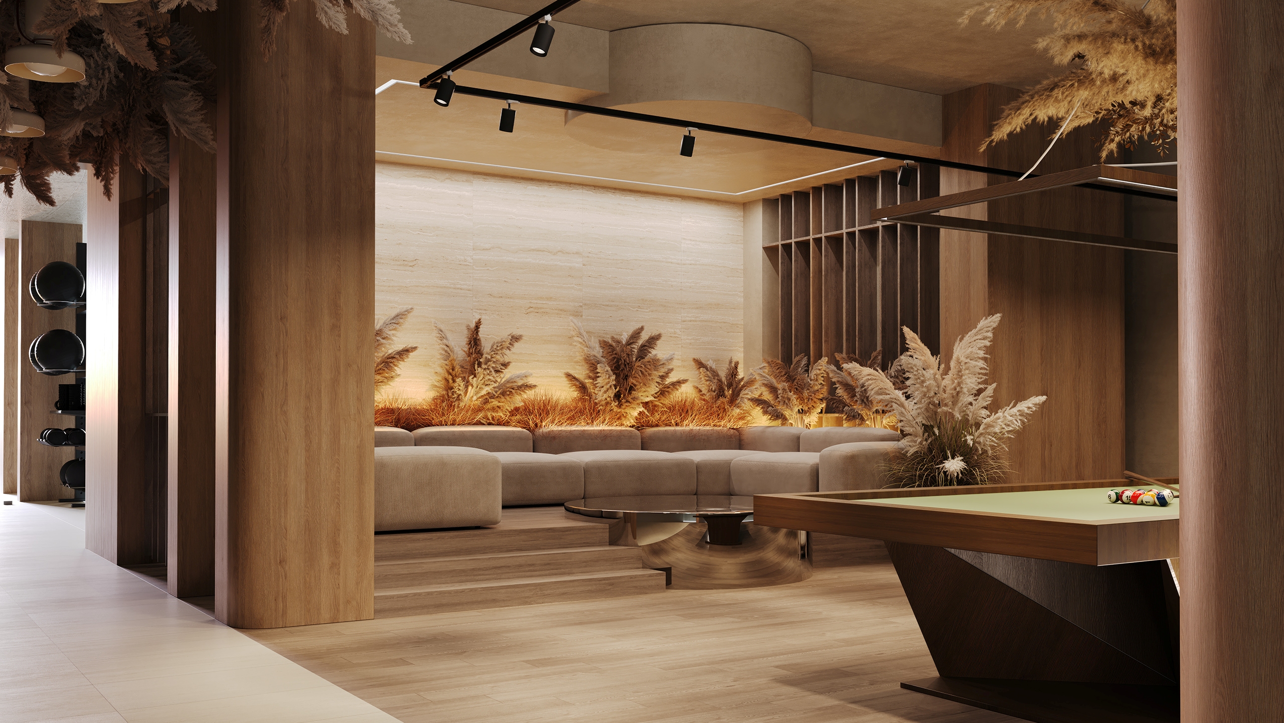 В проектах с деревянным полом и мебелью стоит использовать ковры, текстиль или декоративные акценты в качестве визуального разделителя. Это придаёт глубину и предотвращает слияние текстур.