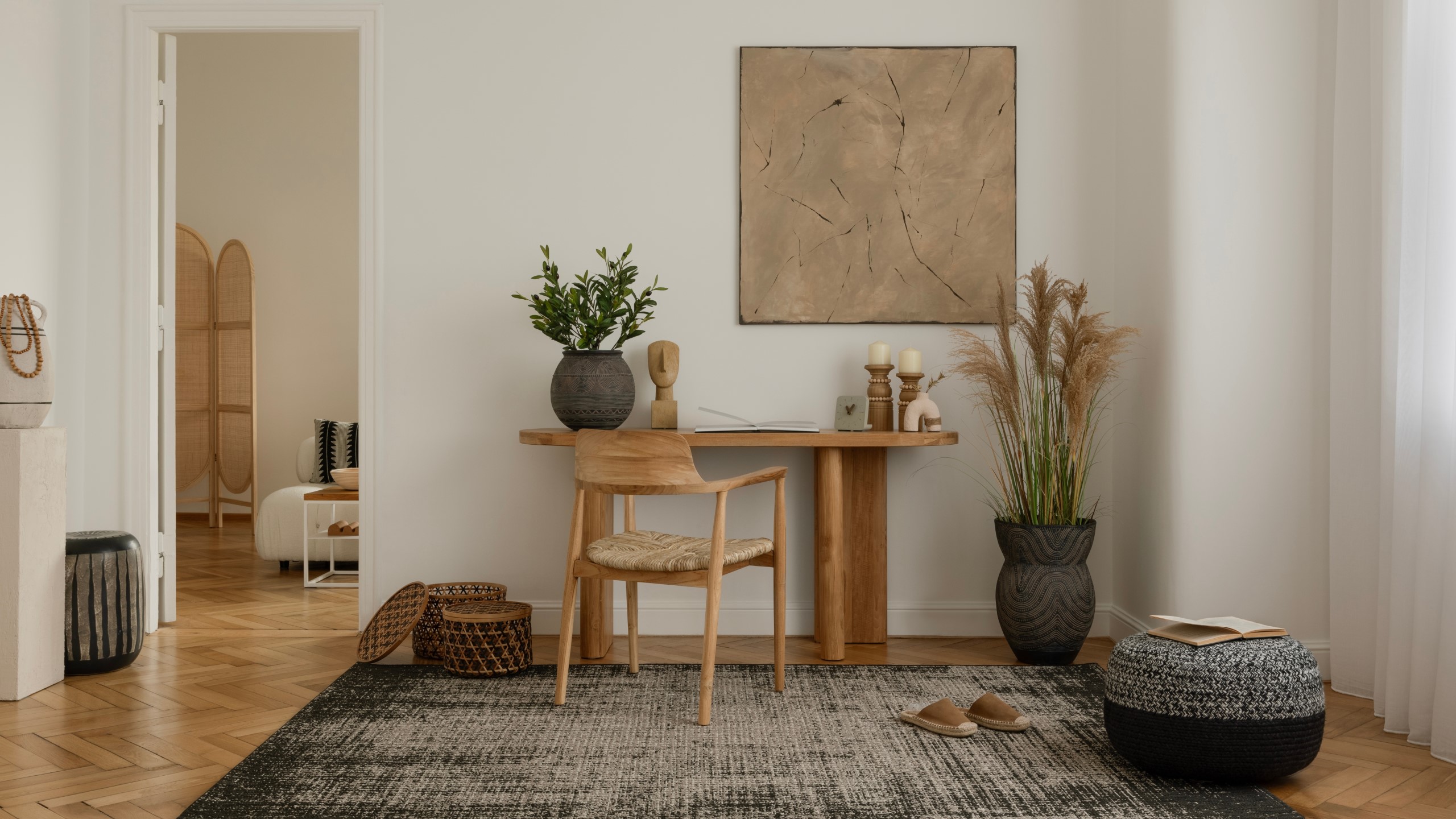 Важно, чтобы ковер не имитировал древесную фактуру буквально — лучше, если он будет работать как отдельный слой.
