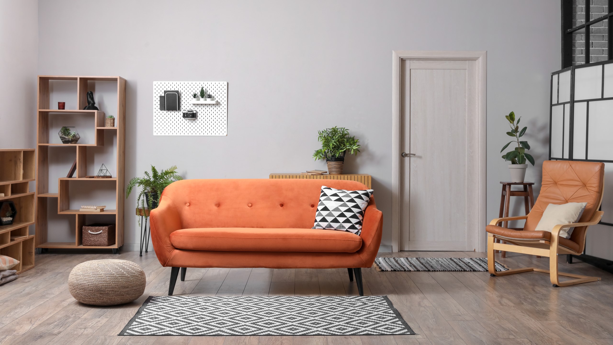 В гостиной — подчеркивают мебель и декоративные элементы. Ставьте двери рядом с мебелью светлых оттенков, добавляйте декоративные элементы на стенах, чтобы двери не сливались с пространством.