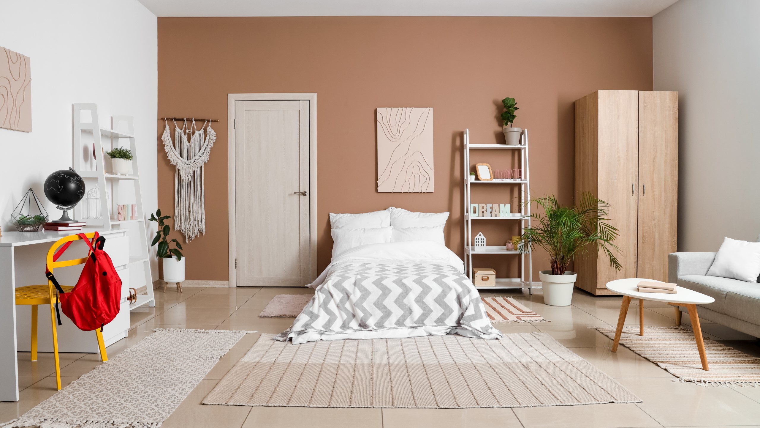подбирать текстиль в тон двери или с мягкими контрастными оттенками (шторы, ковры, подушки);