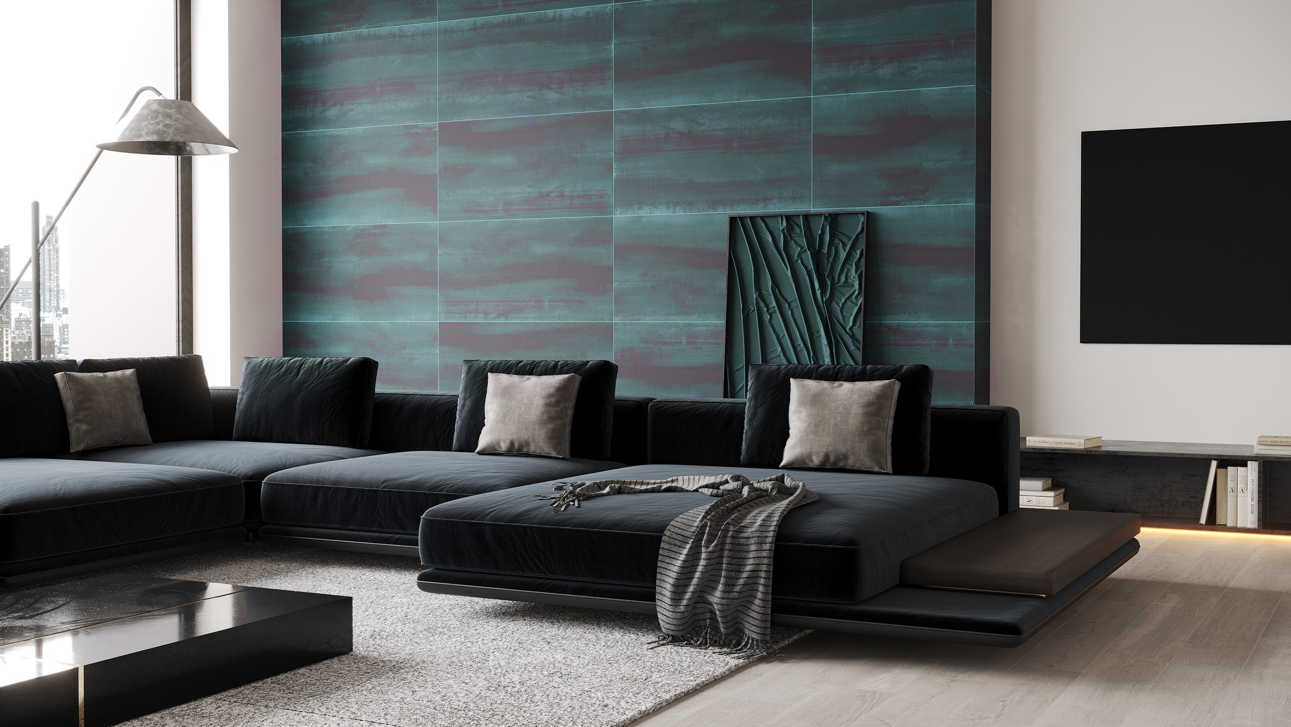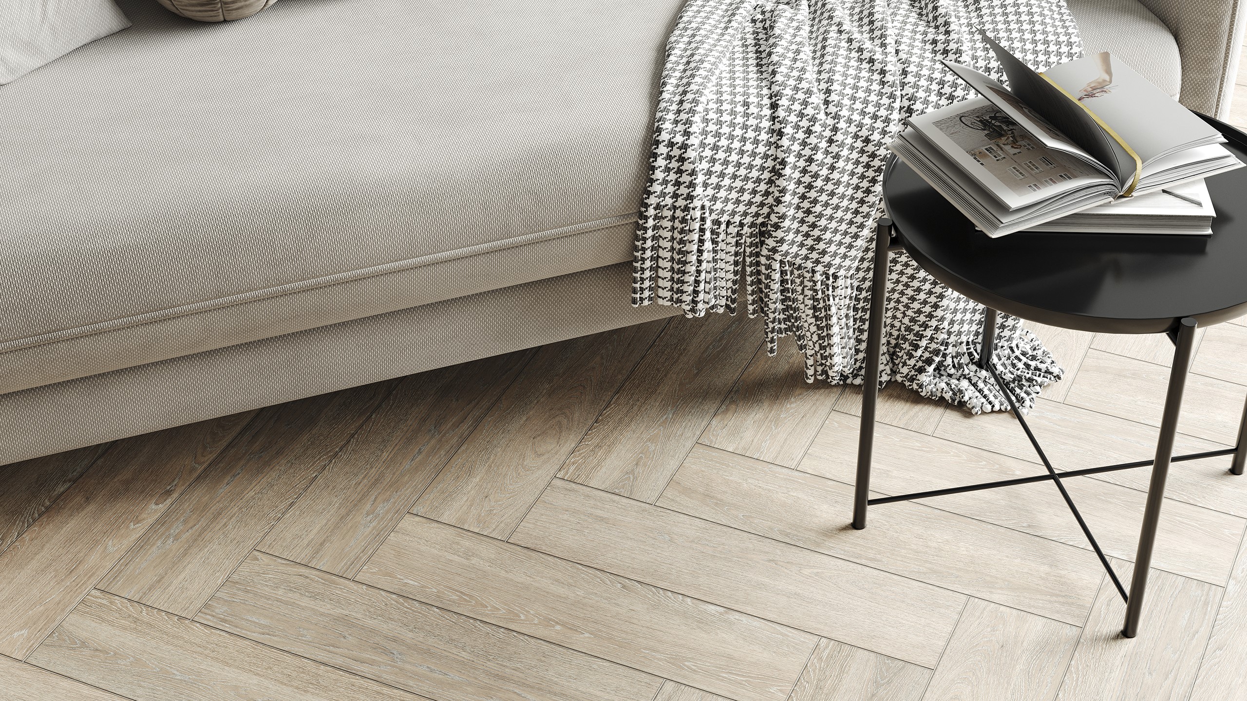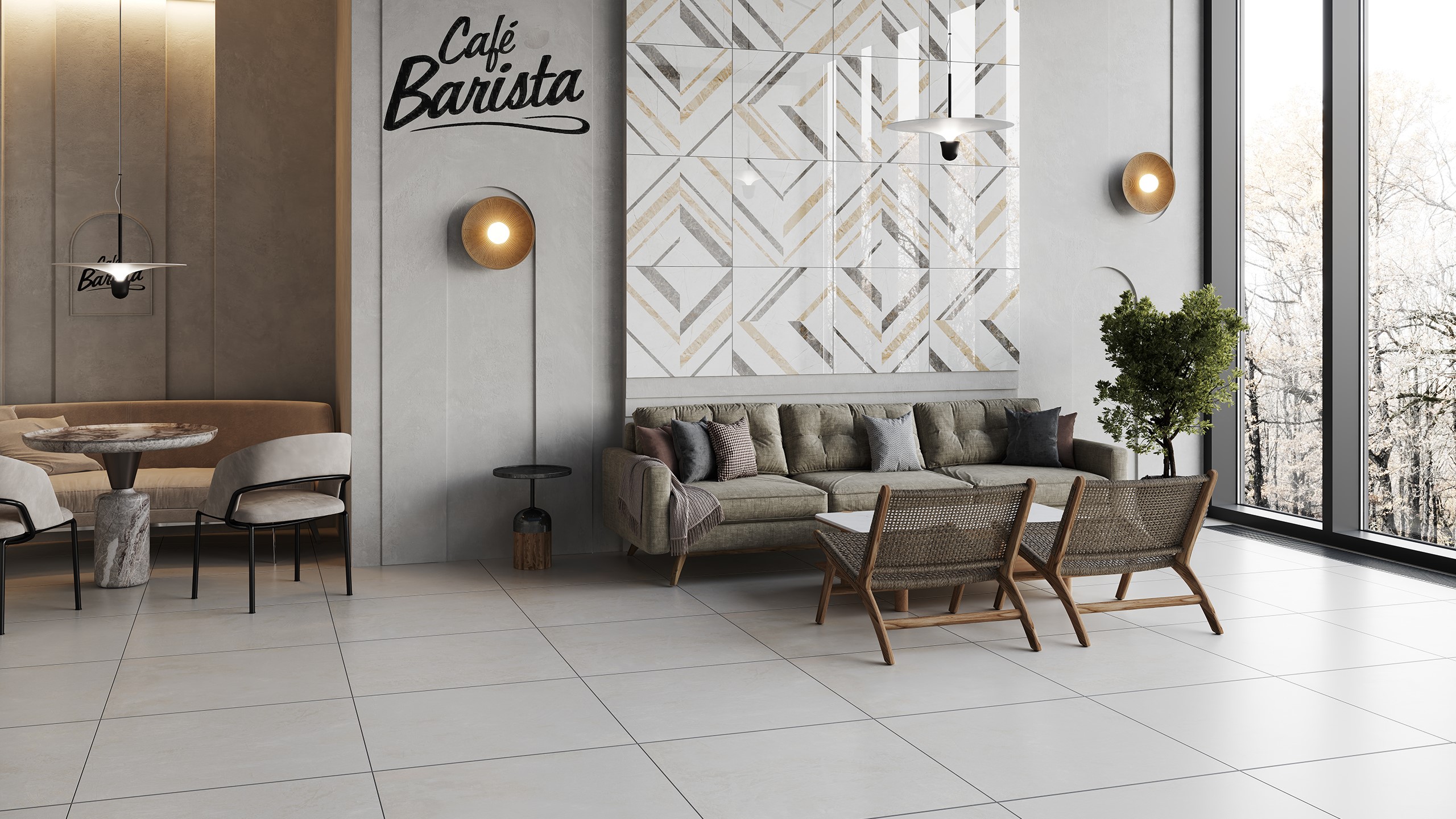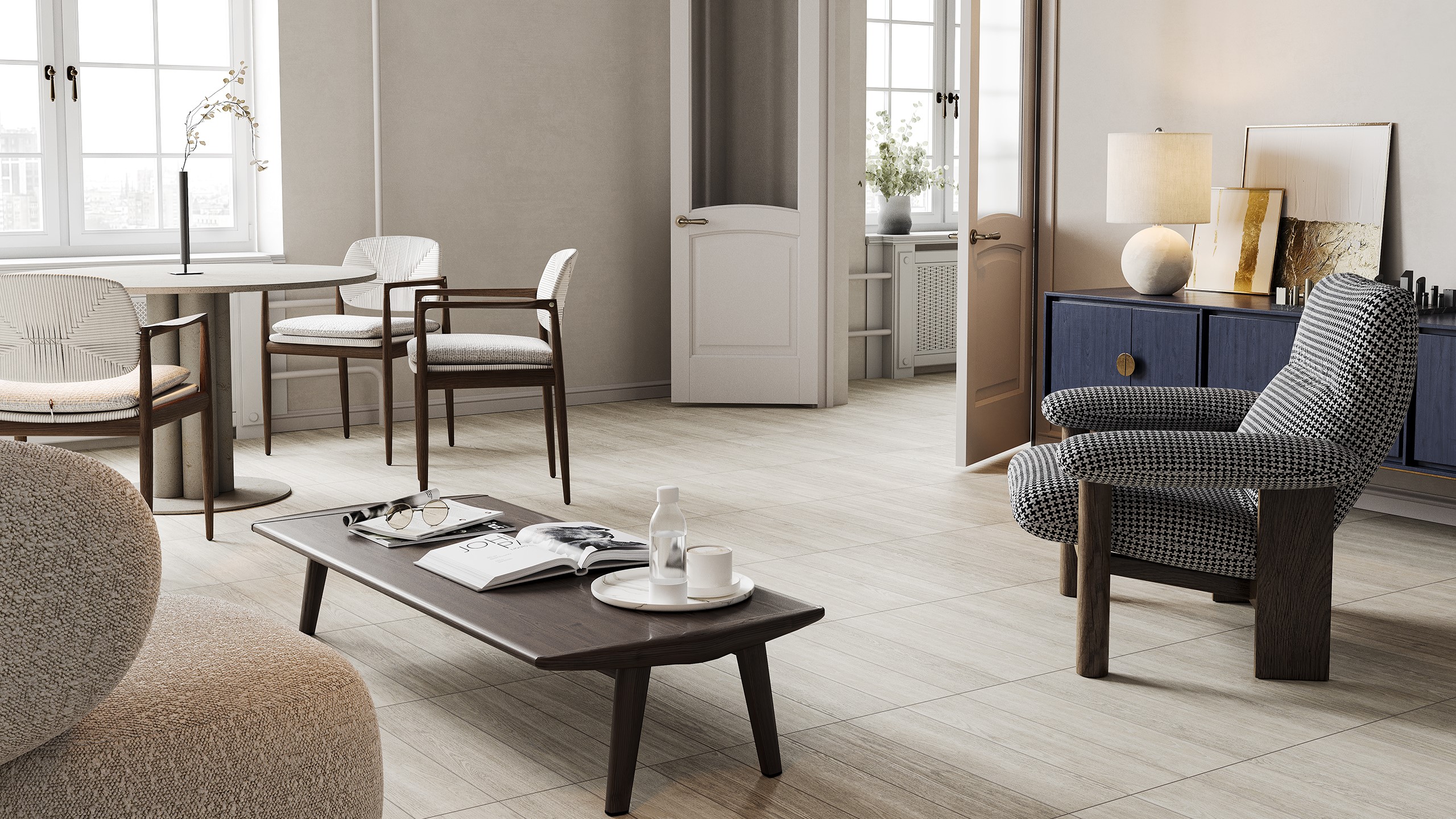 Выбор цвета и покрытия плитки влияет на интерьер. Светлое изделие с зеркальной поверхностью визуально расширяет гостиную и придает ей легкости. Имитация деревянного паркета отлично подойдет для классического интерьера. Особенно хорошо она сочетается с камином. Плитку можно комбинировать с ламинатом. Также для зала рекомендуем модели с имитацией мрамора или орнамента коврового покрытия. Например, коллекция Indigo Illusion из линейки Exotica — с переливами индиго и утончённой графикой — отлично подойдёт для холодных и приглушённых интерьеров. А для ярких минималистичных решений можно использовать Riff от Estima City, вдохновлённую текстурой дуба: она универсальна и элегантно вписывается в современные интерьеры.