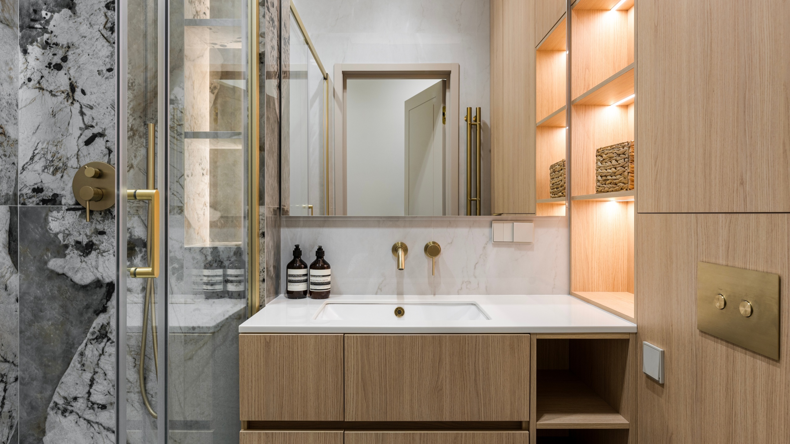 Громоздко выглядящая мебель, наоборот, уменьшает объем. Поэтому в маленькой ванной лучше использовать встроенные или подвесные решения. Они упрощают уборку, делают интерьер аккуратнее и помогают сохранить ощущение порядка. Особенно хорошо работают предметы в цвет стен: они меньше выделяются и не дробят пространство.