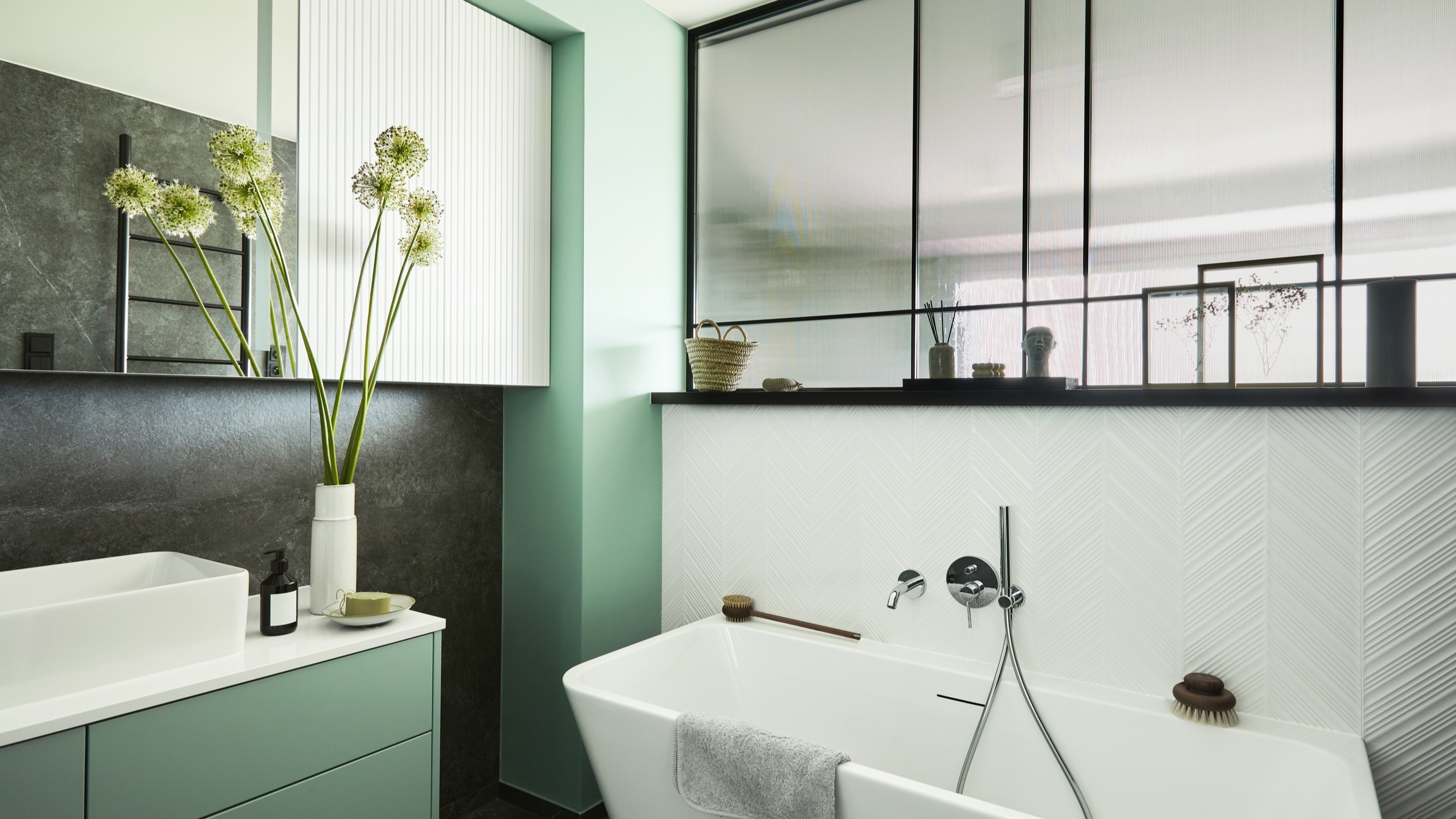 На восприятие пространства влияет не только формат, но и способ укладки. Вертикально ориентированная плитка помогает зрительно увеличить высоту стен: потолок будет казаться выше. Горизонтально уложенная прямоугольная плитка визуально расширяет помещение и помогает раздвинуть стены. Укладка по диагонали на полу создаёт эффект движения и визуального расширения пространства.