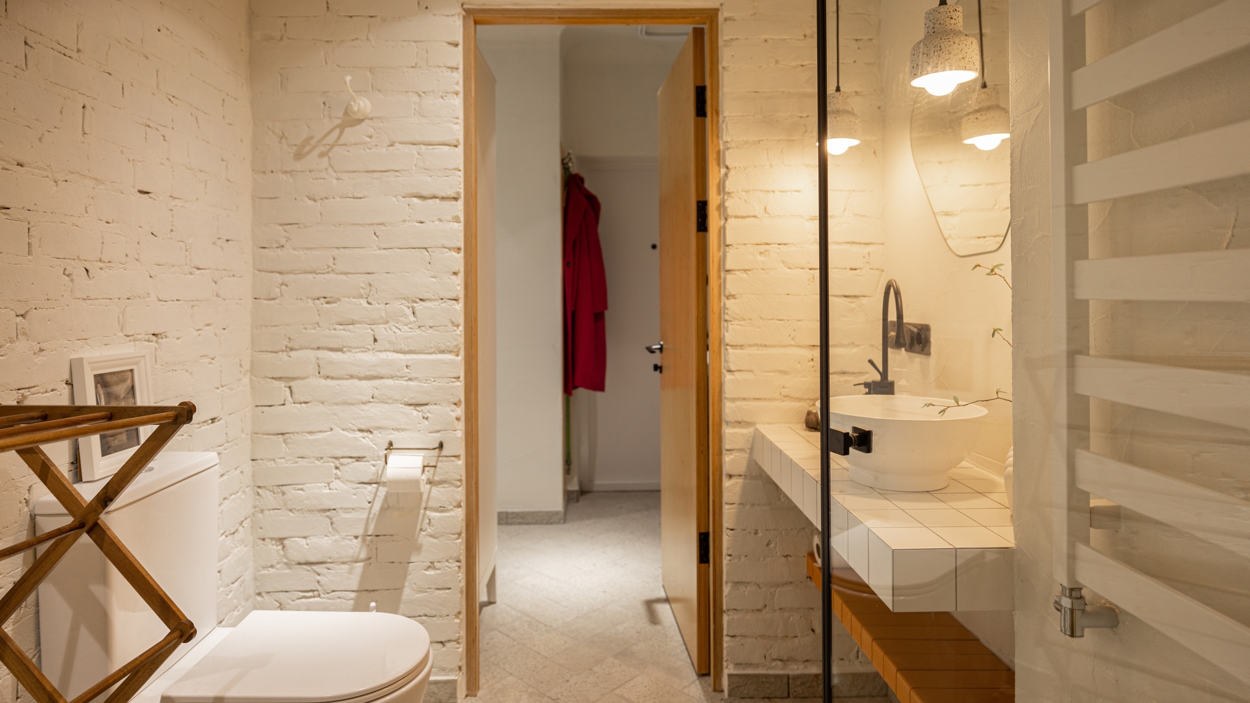 Особенно важно не ограничиваться одним верхним светильником. Один источник света часто делает маленькую ванную плоской. Если использовать несколько уровней освещения, помещение выглядит сложнее, интереснее и просторнее. В сочетании со светлой плиткой и зеркалами этот приём работает максимально эффективно.