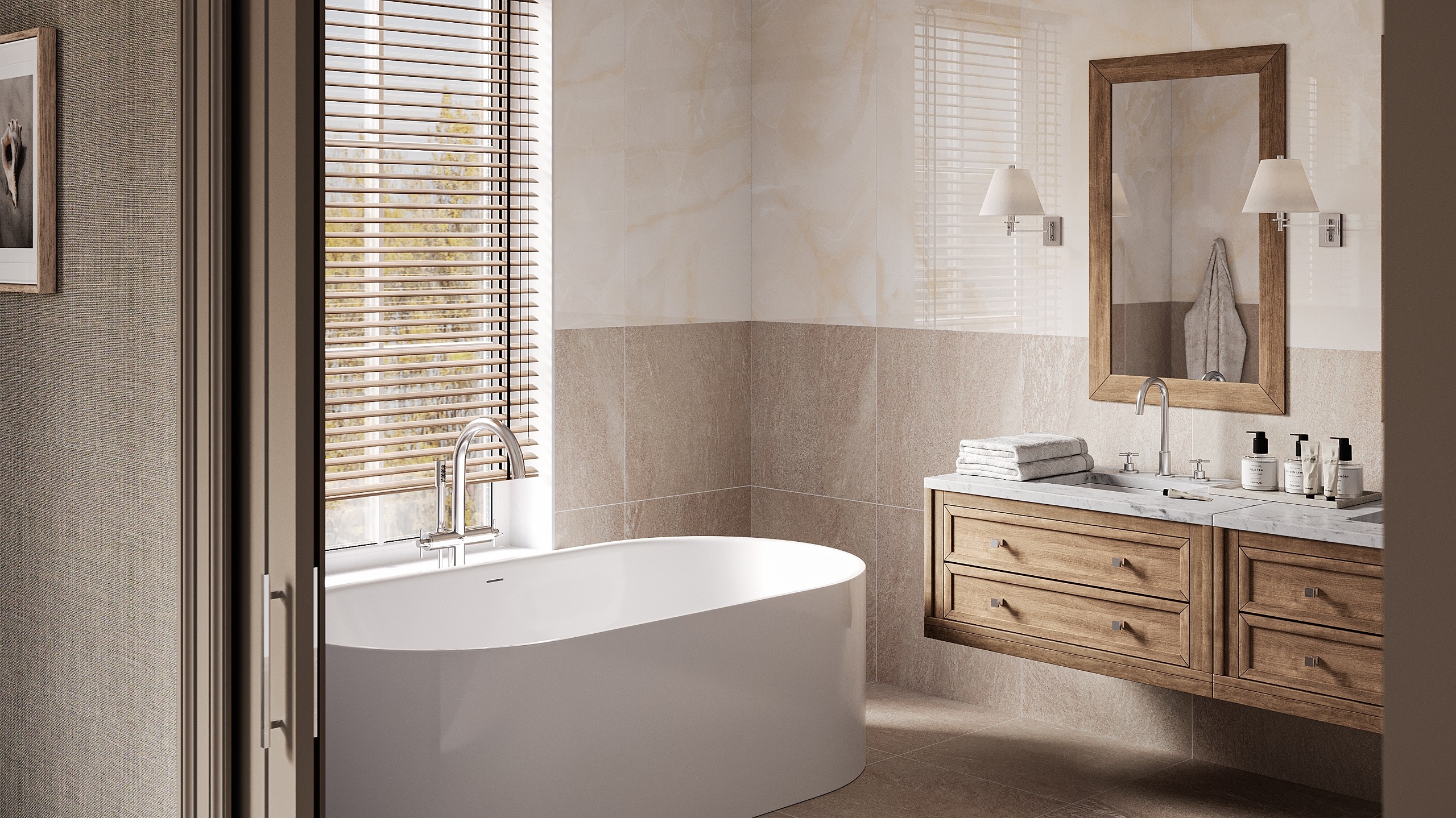 Подходит для интерьеров в стиле кантри, прованс, модерн, ретро. Обратите внимание на коллекцию Riff от Estima City, вдохновлённую классическим дубом. Она подходит как для минималистичных, так и для классических интерьеров ванной комнаты.