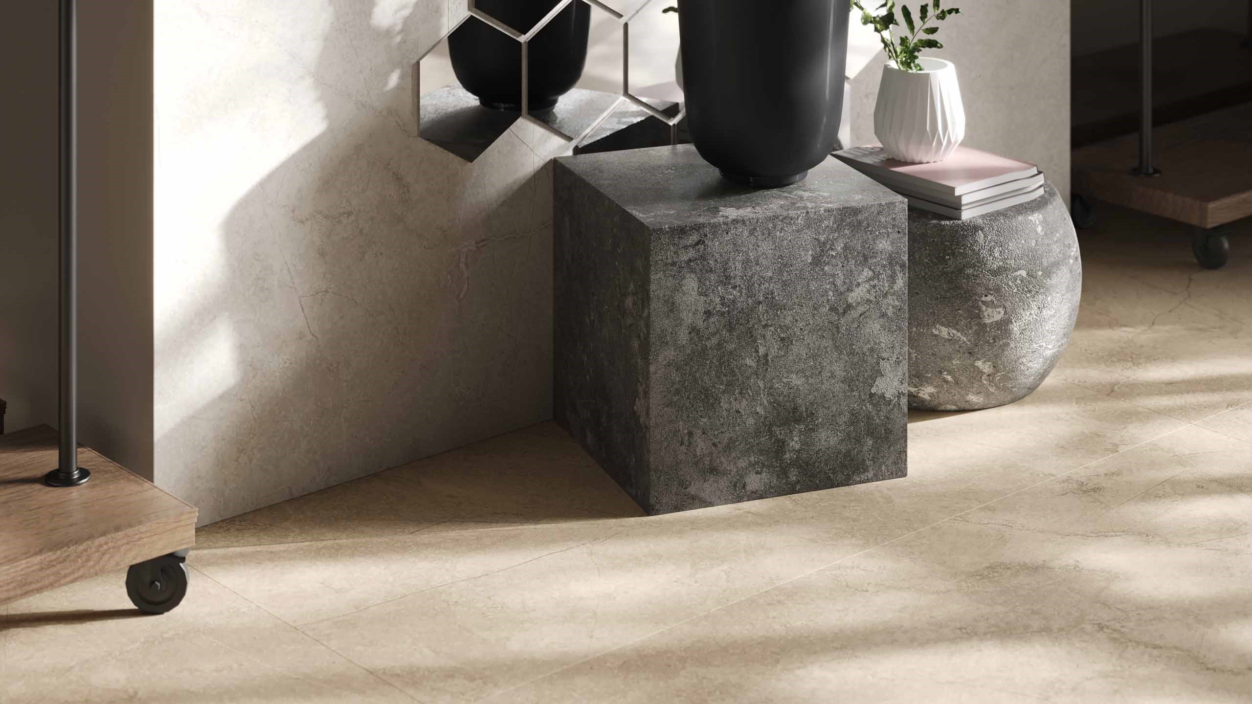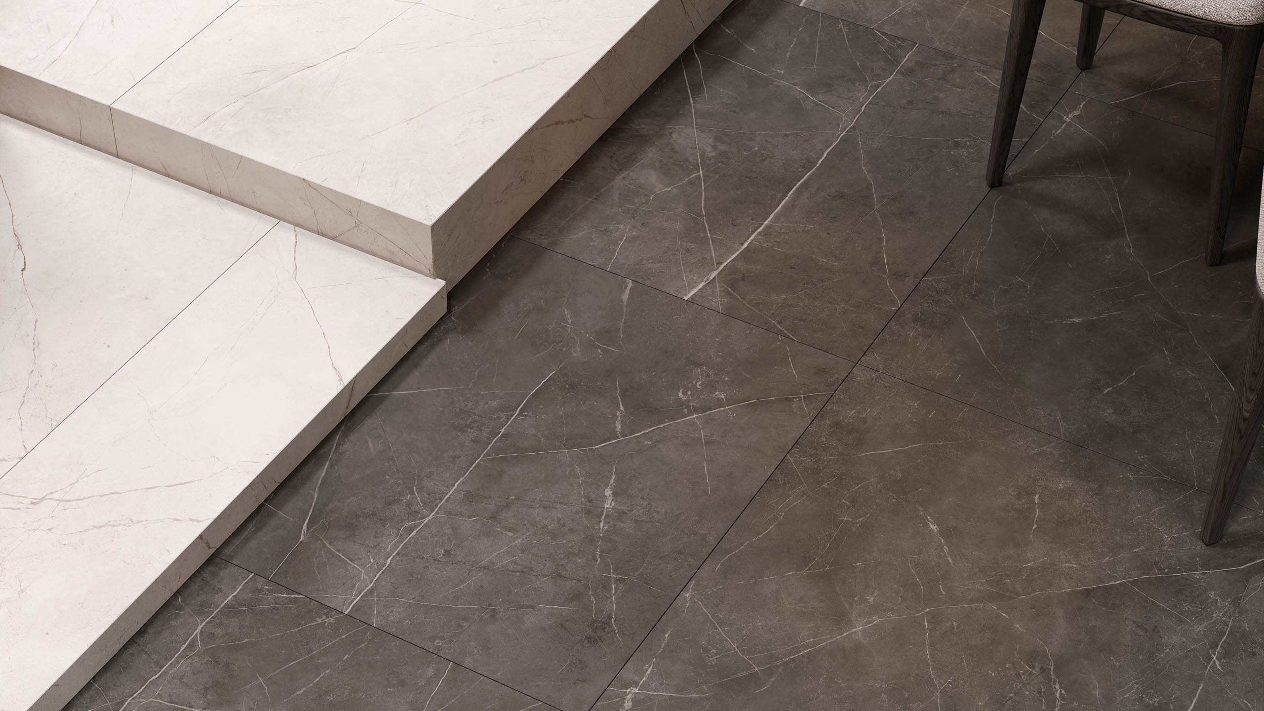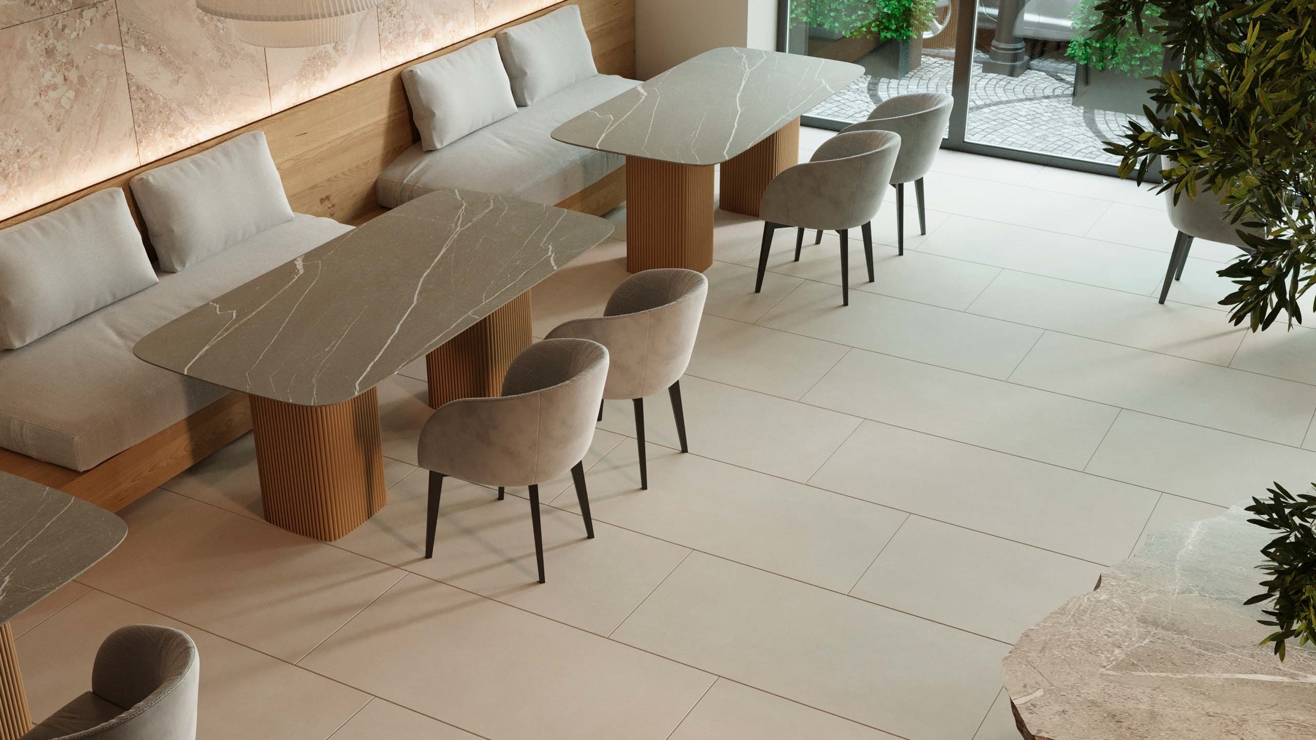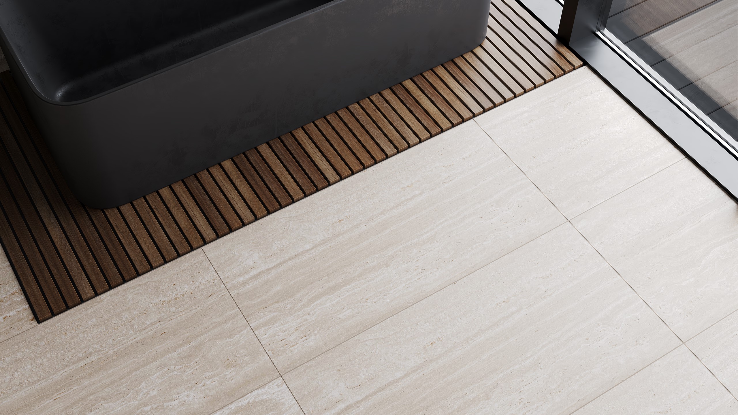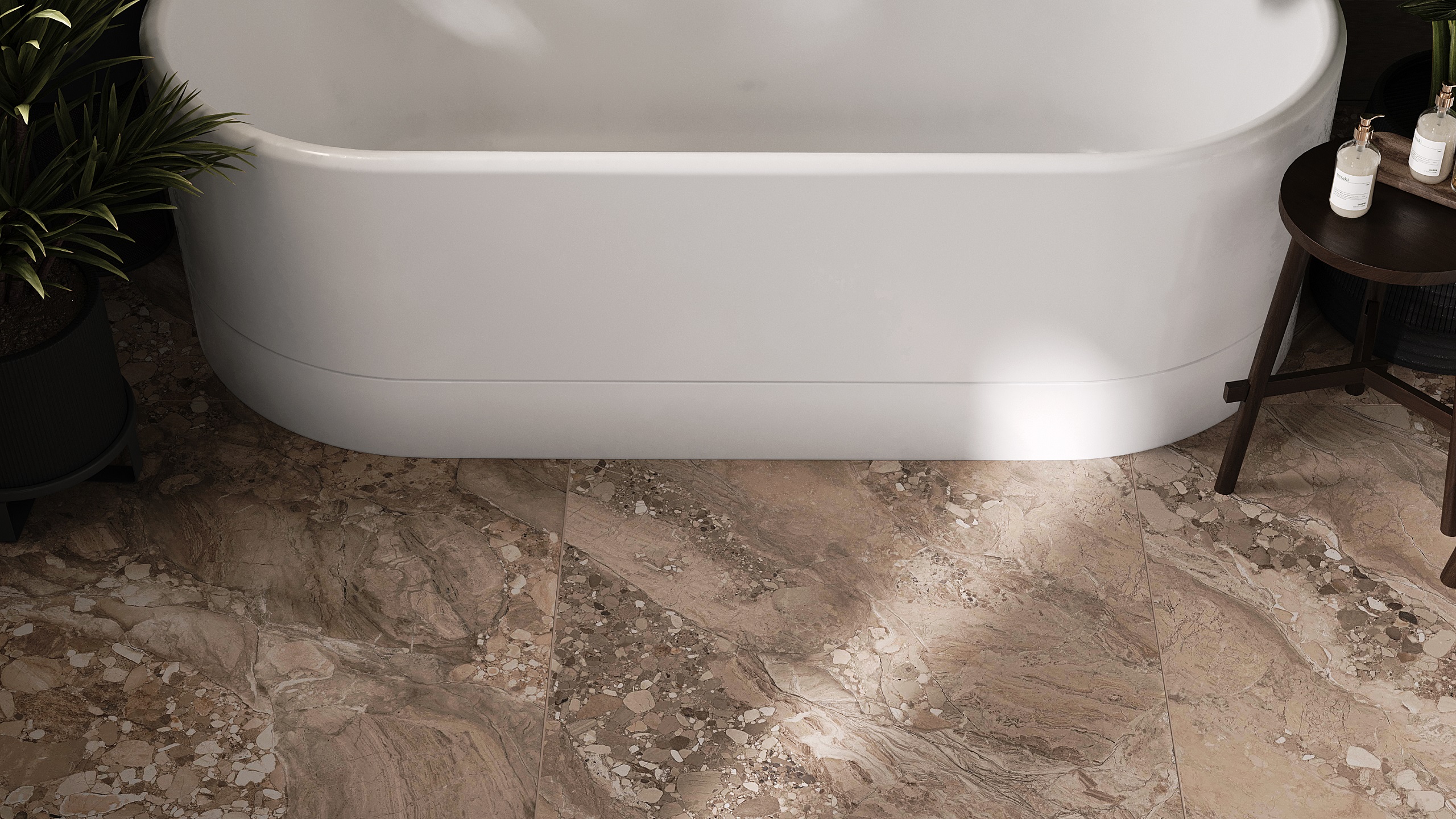 Для ванной идеально подходят крупноформатные решения. Их уникальные текстуры и премиальное качество создают эффект дорогого, гармоничного покрытия, а минимальные швы делают пол практичным и безопасным для влажной среды.