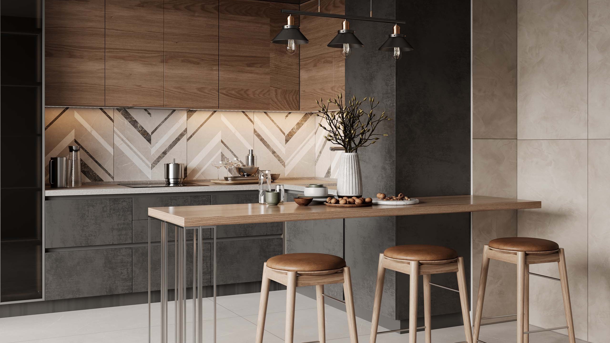 Также стоит учитывать участки под встроенную технику и проходы. Для кухонного пола хорошо подходят коллекции Magmas и Kailas от Ametis by Estima — они создают эстетичную и тактильно приятную поверхность, а разнообразие форматов позволяет легко комбинировать плитку без потери визуального эффекта.