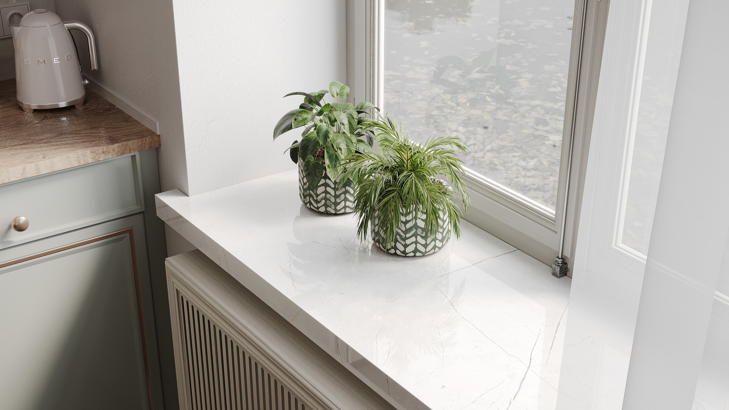 Подоконник из керамогранита устойчив к механическим повреждениям, солнечному свету и влаге. Поверхность не выгорает, не травмируется и не впитывает загрязнения. К тому же керамогранит доступен в разнообразных форматах и текстурах — от имитации натурального мрамора до бетона или дерева.