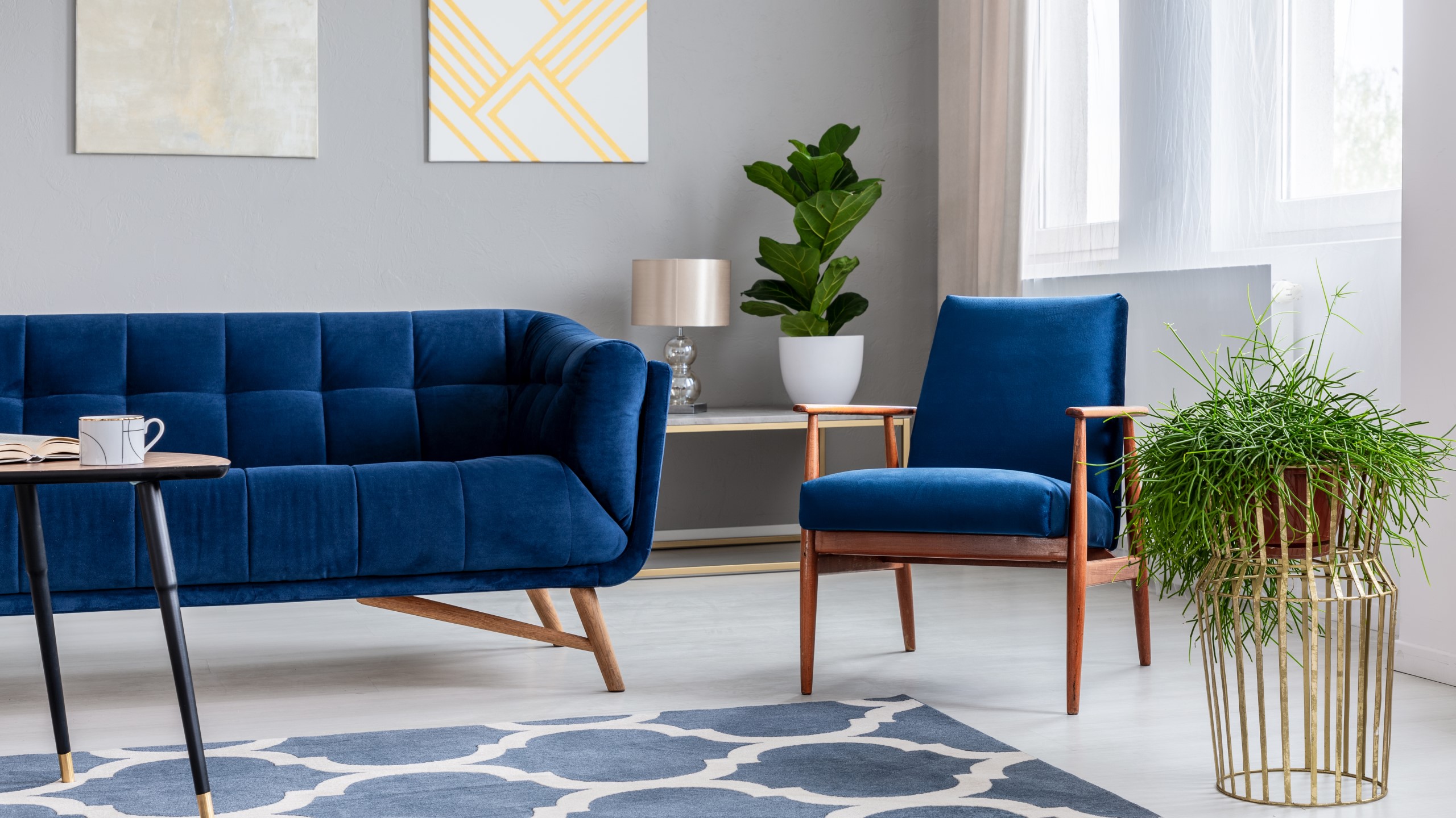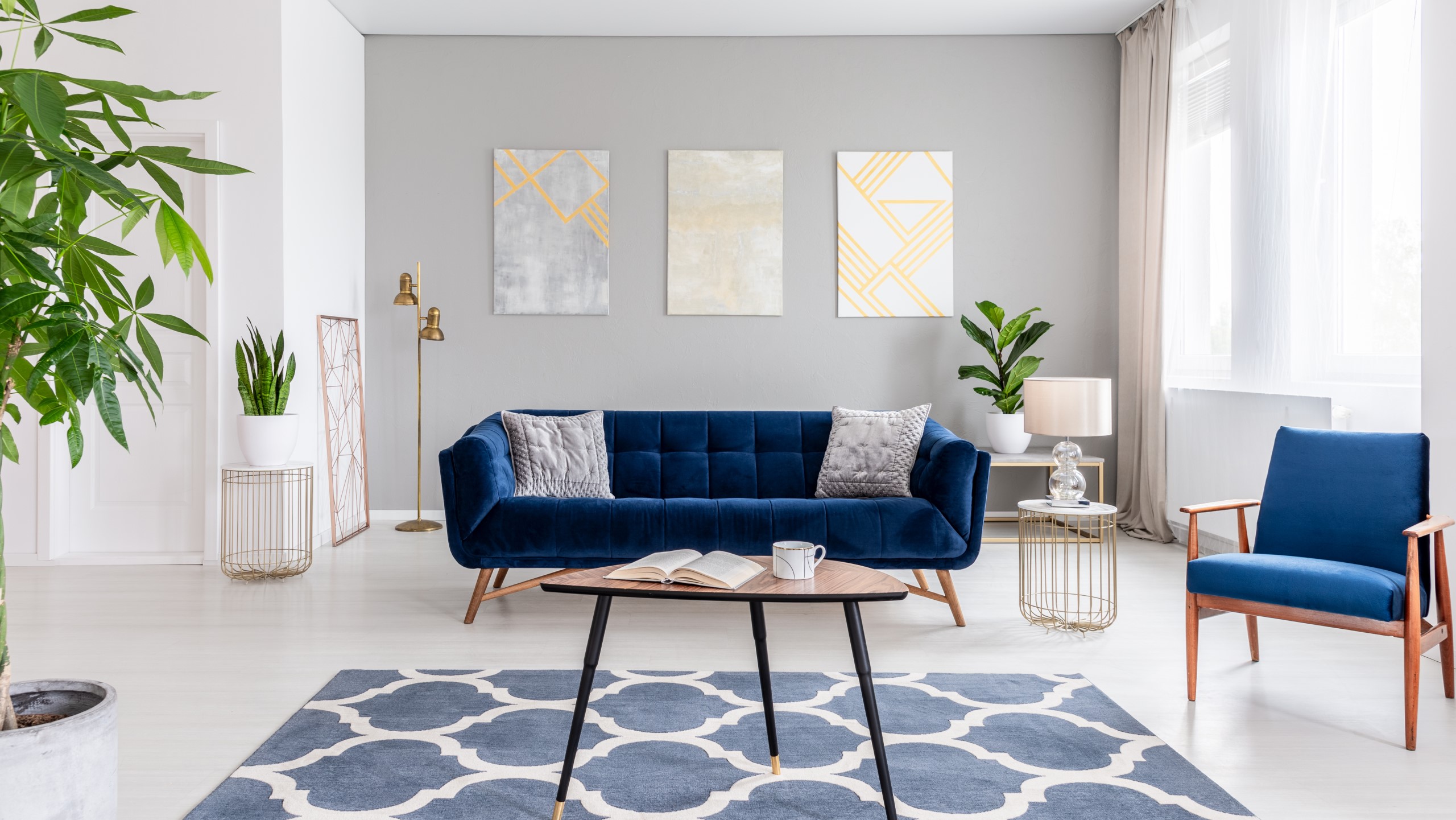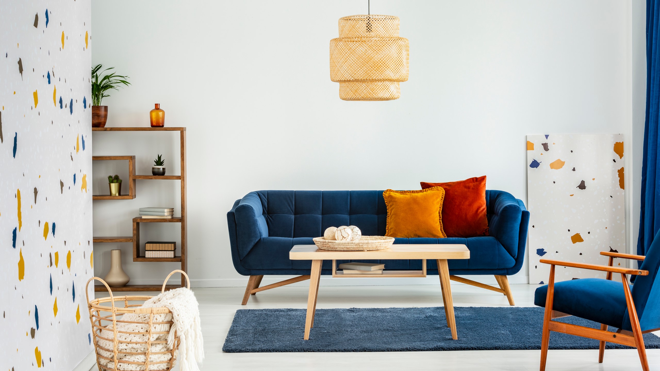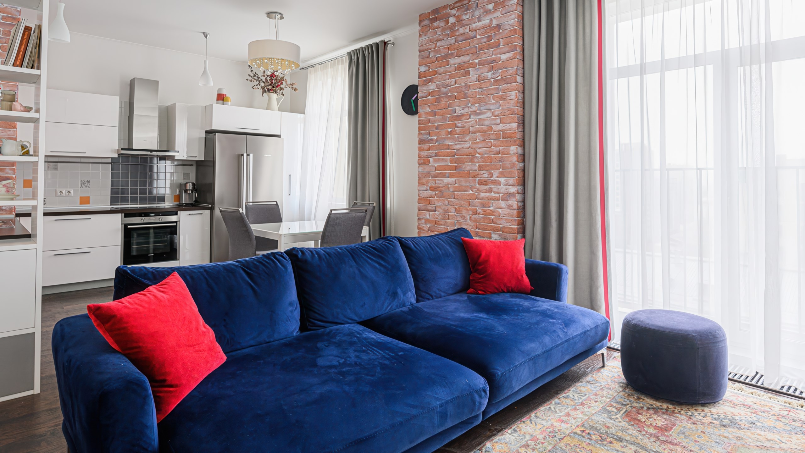 Минимализм. Простая форма синего дивана позволяет создавать акцент на цвете, не перегружая интерьер деталями. Для усиления визуального эффекта стоит добавить несколько ярких текстильных элементов — подушек, пледа или небольшого ковра. Можно использовать мебель с чистыми линиями и гладкими поверхностями, а акцентные декоративные предметы, например, светильники необычной формы, создадут интересный контраст с лаконичностью мебели. Пол и стены можно выполнить из керамогранита под камень или деликатный мрамор.