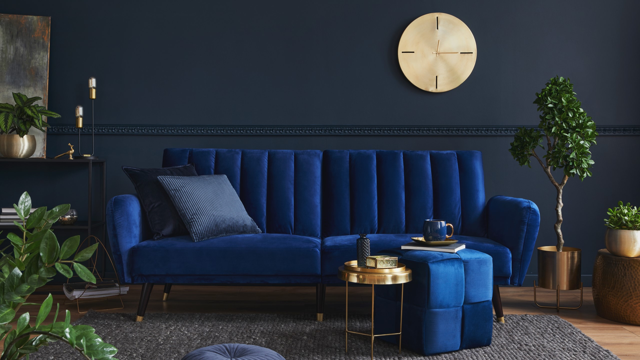Неоклассика. Глубокий синий диван в этой стилистике идеально сочетается с золотыми или бронзовыми аксессуарами — светильниками, рамами картин, декоративными подушками. Для стен можно использовать фактурные панели или декоративные молдинги, чтобы подчеркнуть элегантность. Добавление керамогранита Supreme в отделке стен или подоконников усиливает ощущение роскоши.
