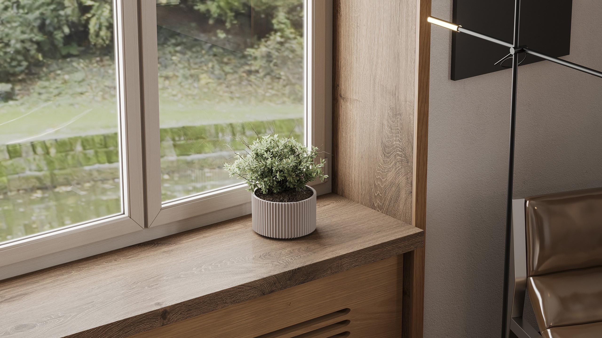 Чтобы дизайн выглядел более цельным, можно оформить подоконники из того же материала. Такой подход создает стильный и эффектный интерьер, где мебель, пол и стены поддерживают друг друга по цвету и фактуре.