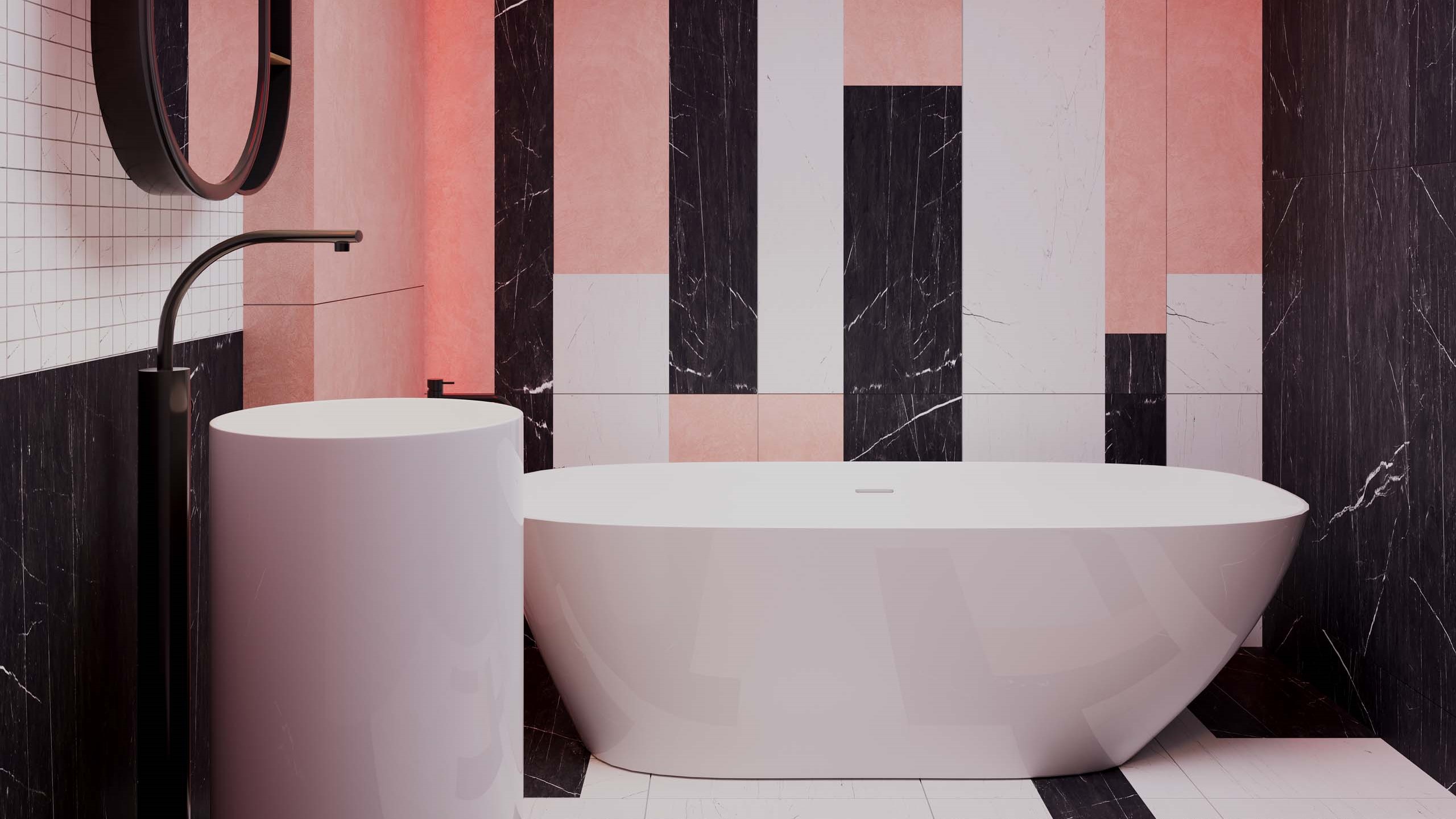 В больших помещениях розовый можно сочетать с текстурой плитки или стеновых панелей, чтобы избежать монотонности.