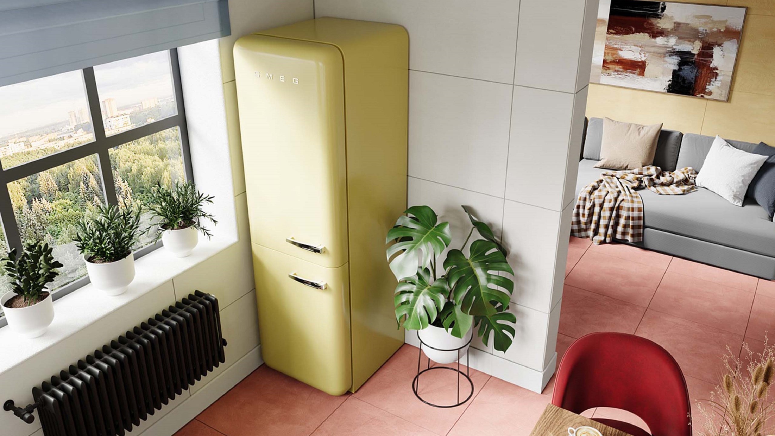 Розовый хорошо смягчает строгую геометрию мебели и архитектурных деталей: попробуйте добавить розовую стену за рабочей зоной кухни или за изголовьем кровати.