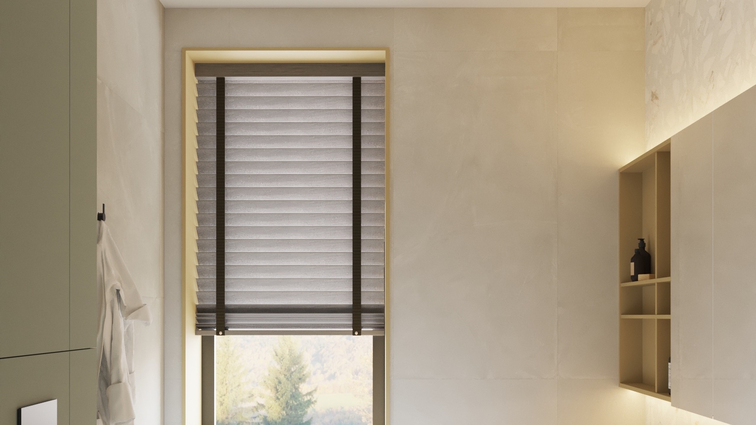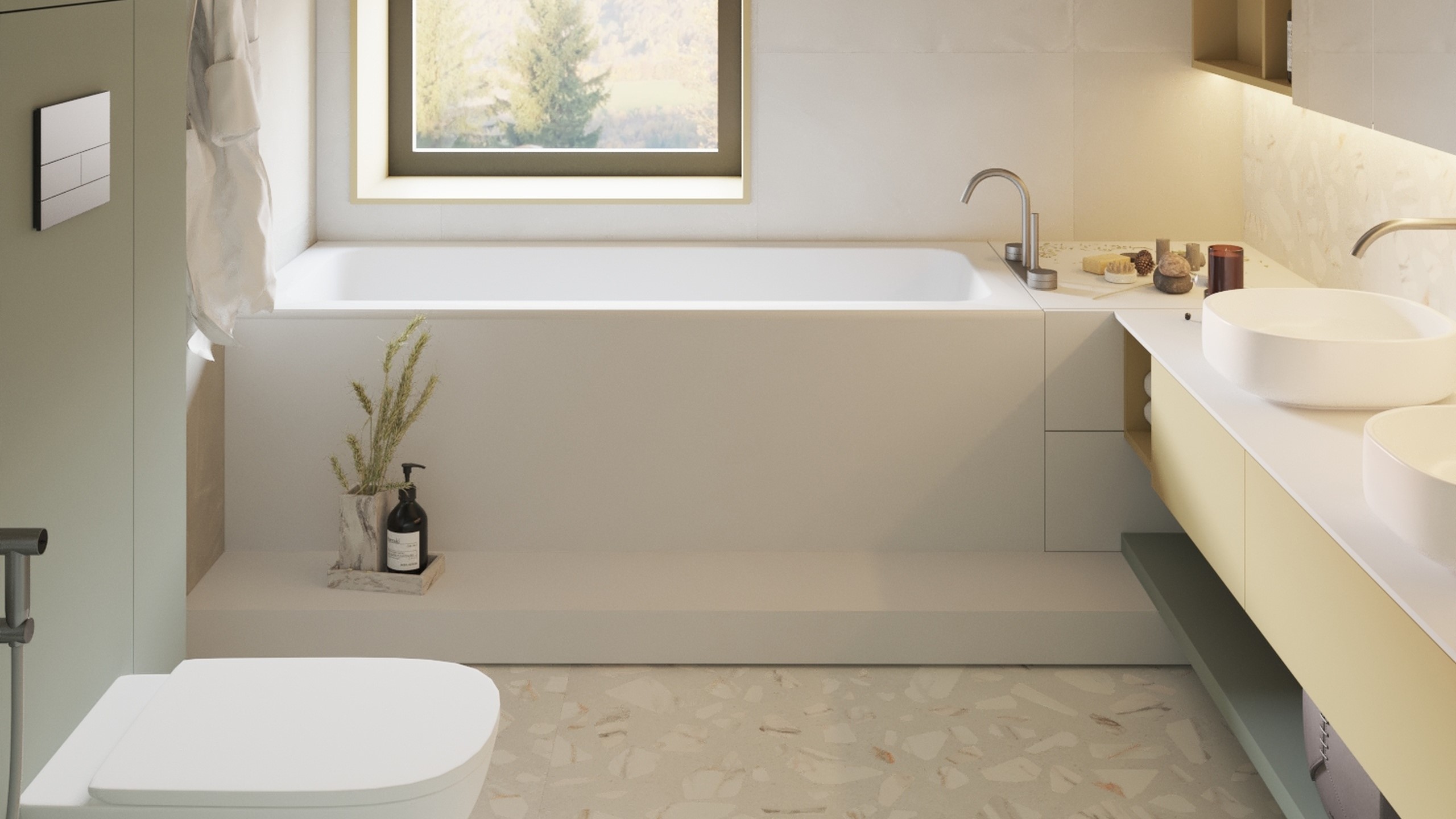 Керамогранит Ametis by Estima становится фундаментальным элементом дизайна: Arti в зоне раковины и на полу добавляет глубину, а Spectrum на стенах обеспечивает чистый и гармоничный фон. В утренние часы плитка приобретает теплый сливочно-лимонный оттенок, делая интерьер особенно уютным и цельным.